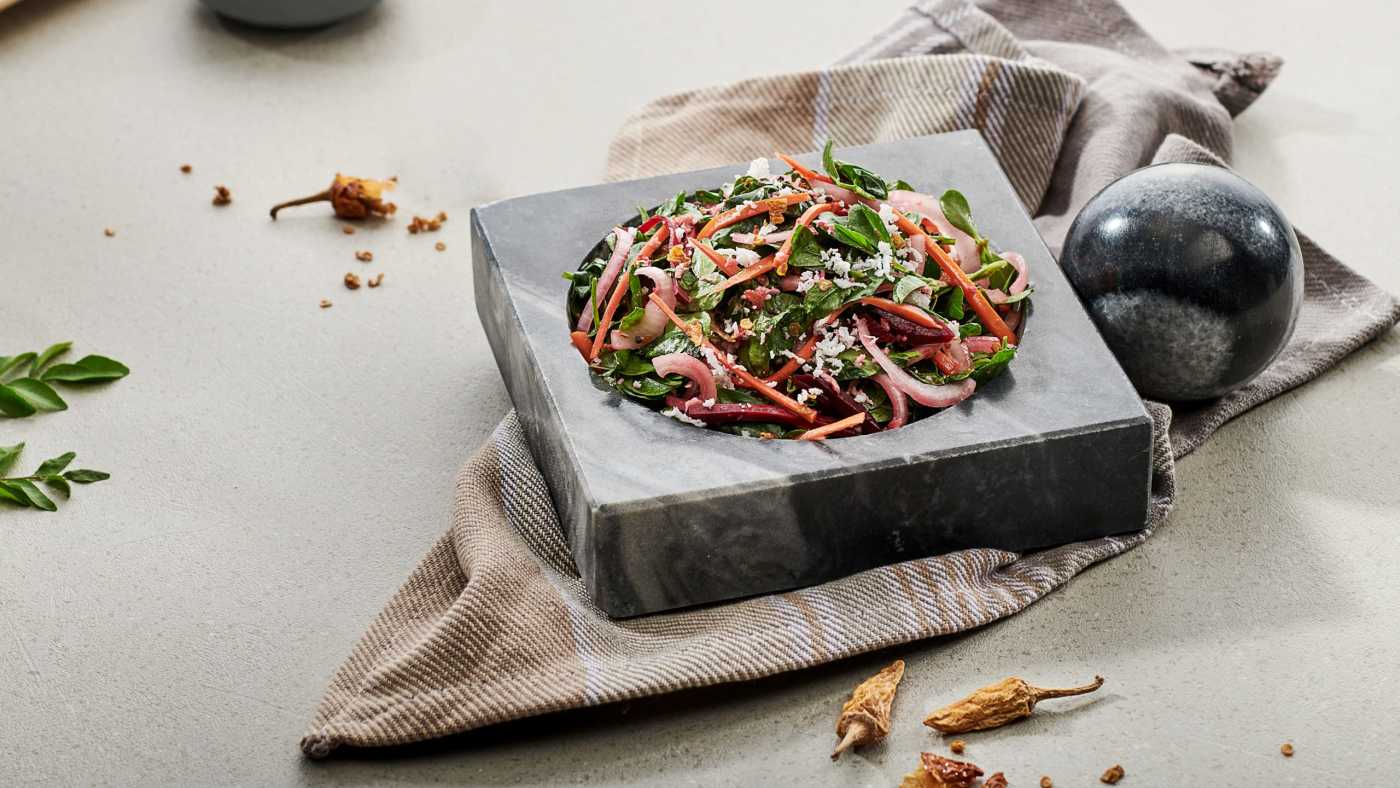 Methi or fenugreek greens are Indian super greens, rich in antioxidants and minerals such as magnesium and potassium. I love how carrots, beets, and fresh coconut play the perfect foil to methi’s inherent bitterness. Tempered spices in Indian-style tadka make for a flavorful and nourishing addition to the salad.